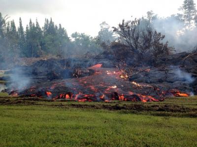 熔岩流迫近帕霍亚镇 熔岩流前沿有植物着火冒烟 地质学家前往研究熔岩流流向...