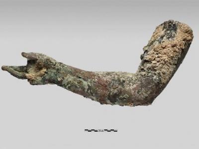 表面已遭腐蚀的雕像手臂,一直埋藏于海底。潜水员上...