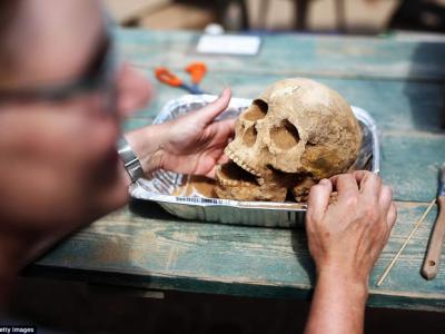 一块哺乳动物头骨化石,牙齿窝里的沉积物,原来是史前蜜蜂筑的巢穴。图片来源:uux...