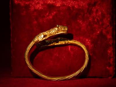 从萨尔马提亚古墓中发现的许多古代文物都描绘了动物,比如这只豹子形状的金臂环。(...