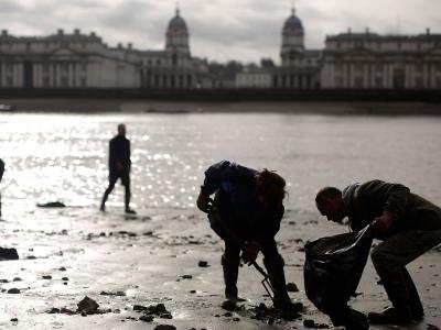 志愿者们正在清理泰晤士河岸边的垃圾和杂物。(图片来源:uux.cn/Getty Images)(...