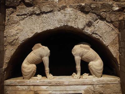 两尊人面狮身像端坐在安菲波利斯陵寝入口处的大理石门楣上。照片提供:GREEK MIN...