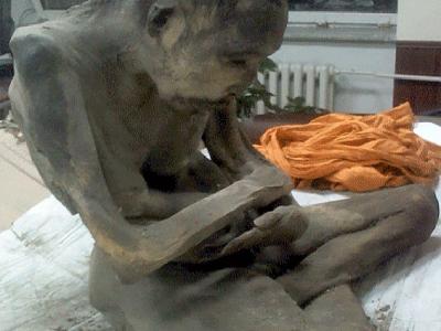 在蒙古发现的一具僧人干尸,身体仍保持莲花坐姿势。目视检查显示这具干尸拥有大约...