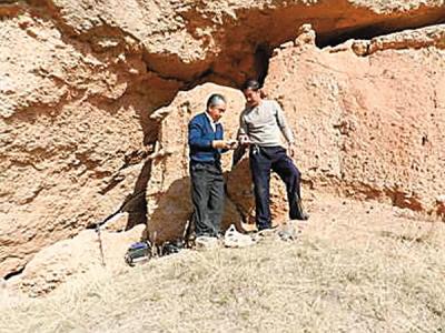 中卫市洞子湾古人类洞穴遗址外景(左一为宁夏博物馆原馆长、副研究员周兴华)。 ...
