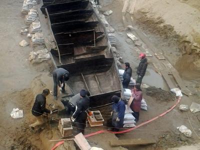 2014年1月6日,河南洛阳古沉船发掘现场,为防止古沉船受损,考古人员正在为其抹药...