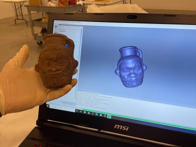 残留物分析发现,在笔记本电脑上的3D模型旁边,描绘矮神贝斯的古埃及花瓶曾经放过一...