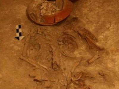 在布拉格郊区发现的这具石器时代的男性骸骨头朝东,身边摆放的是日常使用的罐子,...