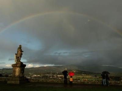 图片展示的就是业余金属探测迷布思发现地下黄金宝藏的地方。人们正抬头仰望发现地...