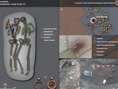 研究结果的可视化——a:双重埋葬;b和c:墓地内的位置;d: 2个金吊坠,作为陪葬品...
