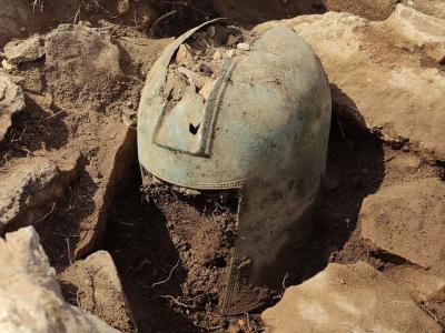 这顶有2500年历史的头盔被发现直立在土堆上的一个石头结构中。(图片来源:uux.cn/...