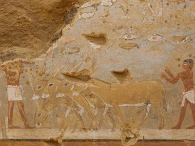 墓中的一幅壁画展示了驴子在地板上打谷。(图片来源:uux.cn/埃及旅游和文物部提供...
