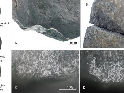 特有的宏观(顶部)和微观(底部)痕迹可用于确定石器边缘的使用方式。学分:uux.cn...