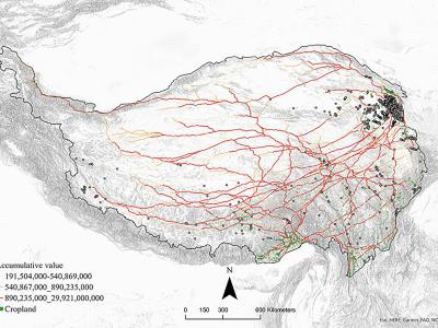 农牧民互动的模拟“流动高速公路”与地理定位的考古遗址重叠,这些考古遗址的年代约...