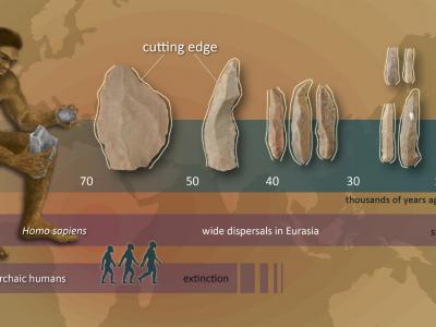 石器尖端生产力的提高(白线所示)并不是在智人在欧亚大陆广泛分散之前或开始时发生...