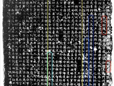 唐朝一位已故精英的墓志铭拓印(杜忠良)。红色=姓氏和名字;蓝色=祖父和父亲的全名...