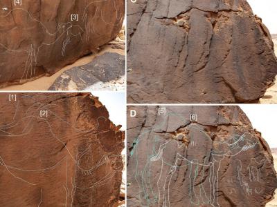 在沙特阿拉伯发现的雕刻在石头上的已灭绝骆驼物种的真实大小的图像。鸣谢:uux.cn/亚...