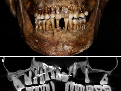 17世纪法国贵族安妮·德阿莱格里(Anne d’Alegre)的牙齿,一根金线穿过几颗牙齿。...