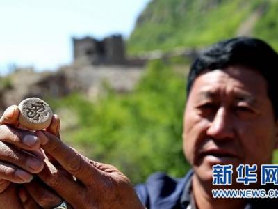 5月5日,河北省秦皇岛市抚宁县驻操营镇板厂峪景区,工作人员展示在明长城敌楼废墟...