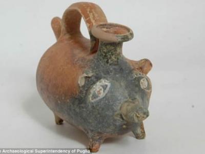 意大利一座古墓内发现2400年前小猪造型赤土陶奶瓶 在这个古墓内,考古小组共...