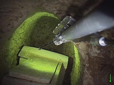 装配摄影仪的遥控机械手臂探测到耶稣的墓室 骨灰盒上4个希腊线条文字翻译之后...