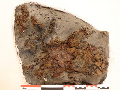 从考古遗址移走后,在奥斯陆Bispekiva南部发现的中世纪铁手套遗迹。(图片来源:uu...