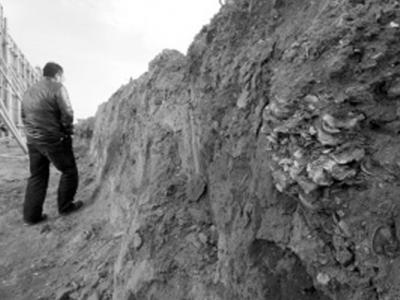 被挖开的土层断面上露出红褐色的火烧土和大量贝壳,图片左侧就是广告围挡。 旅顺...
