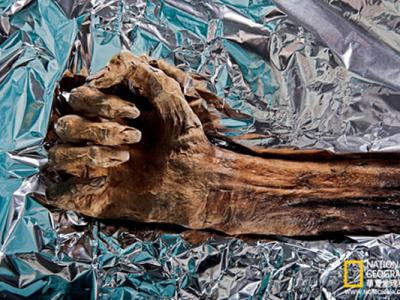 冰人的手臂搁在无菌铝箔上自然解冻。 荷兰艺术家阿德里、阿尔方斯· 肯尼斯利...