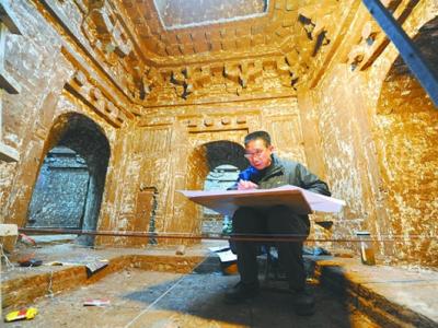 考古人员在墓葬内绘制图案 考古人员正在清理墓室内的壁画 “这个北宋时期的壁...