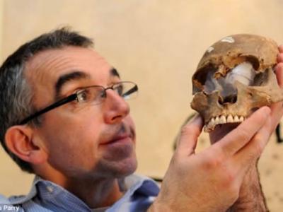 约克郡博物馆馆长安德鲁·莫里森手里举着在博物馆修缮时发现的古罗马角斗士头骨 ...