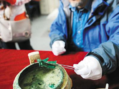 考古队队长刘呆运展示从铜鼎“骨头汤”里取出的动物骨骼 2400余年前的骨头汤竟然...