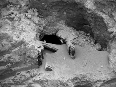 从洞口可以看到棺木已被破坏 近日,朝阳区融科橄榄城小区北侧的工地内挖出一口棺...