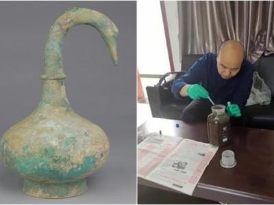 河南出土2200年前西汉初期“鹅首曲颈青铜壶” 装3000ml不明液...