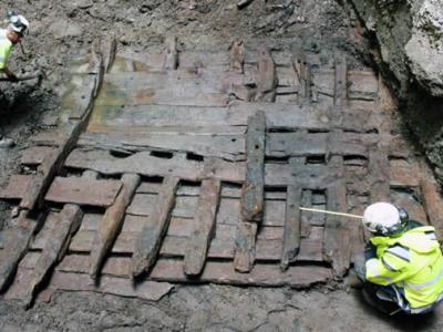 瑞典斯德哥尔摩市中心发现建造于十六世纪末的木制船只残骸(© 照片 : Arkeolog...