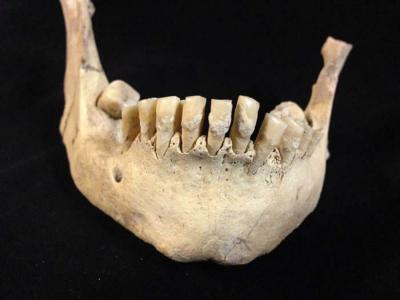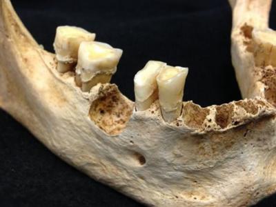一块哺乳动物头骨化石,牙齿窝里的沉积物,原来是史前蜜蜂筑的巢穴。图片来源:uux...