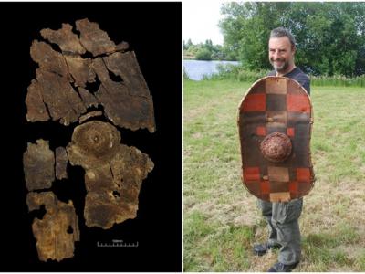 右图为研究人员模仿树皮盾所制的复制品。考古学家相信出土地点...