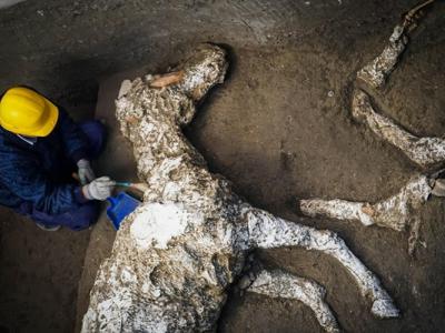庞贝古城出土一具被火山灰石化的战驹遗骸。其他未被石化的遗骸...