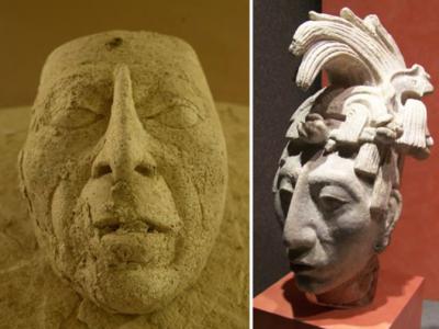 出土的灰泥面具(左图),相信属于帕卡尔大帝。考古学家在图中...