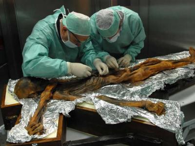 研究人员为冰人奥茨(Ötzi the Iceman)胃中的内容物取样...