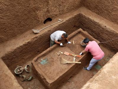 目前已进行清理和挖掘的21座长方形竖穴土坑墓葬中,20座发现有...
