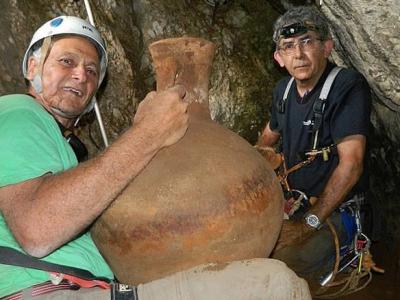 考古学家在以色列洞穴里发现2000年前用于盛放葡萄酒的双柄瓶、...