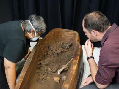 考古人员发现棺材里有木乃伊残骸。木乃伊的足部和脚踝骨都保存...