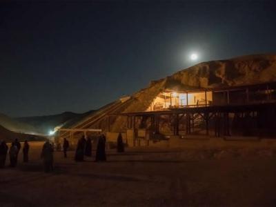深夜,工人聚集在图坦卡蒙陵墓附近的行政楼外。扫描进行的时间...