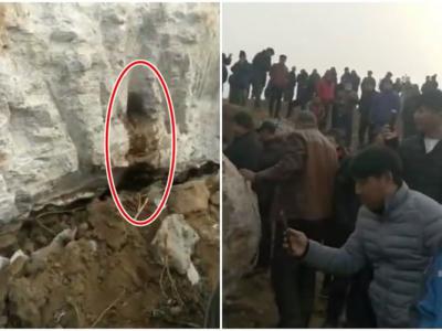 出土“棺椁”的一处缝隙(红圈示)流出如“血水”的红色液体,...