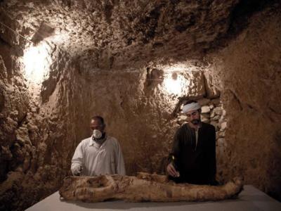 两位工人正在清理一具在埃及路克索找到的古代木乃伊。 PHOTOG...