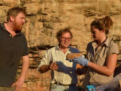 考古学家发现一批人工制品。考古学家在岩棚挖掘。挖...