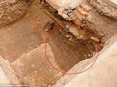 考古学家在红线标识的区域发现一具男性尸体,认为可能是理查三世,该挖掘地点位于...