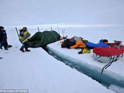 在北极测量考察过程中,英国科学家小组所在帐篷下方的冰层裂开一个大口子。 科...