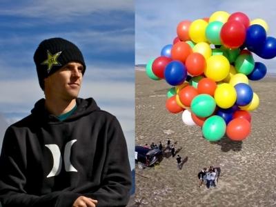 美国著名极限运动家坐氦气球吊椅升空 8千