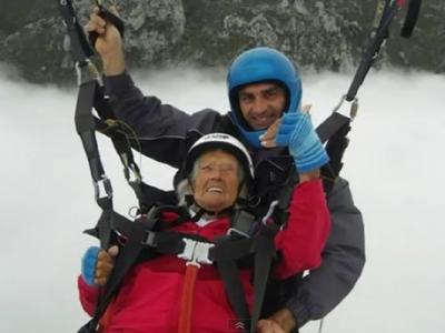英104岁老人完成双人滑翔伞跳伞