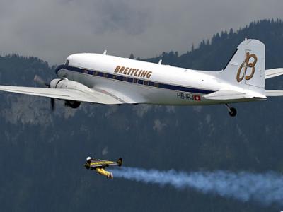 瑞士“钢铁侠”与客机共同飞翔